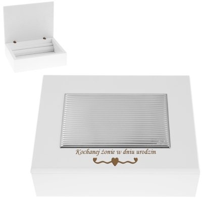 Biała drewniana szkatułka posrebrzana paski z grawerem to nie tylko praktyczny produkt do przechowywania, ale również piękna dekoracja, która doda elegancji Twojemu wnętrzu. Spraw sobie lub bliskiej osobie niezapomniany prezent, który z pewnością wywoła uśmiech na twarzy. Wybierz naszą szkatułkę i odkryj połączenie stylu, funkcjonalności oraz osobistego akcentu!