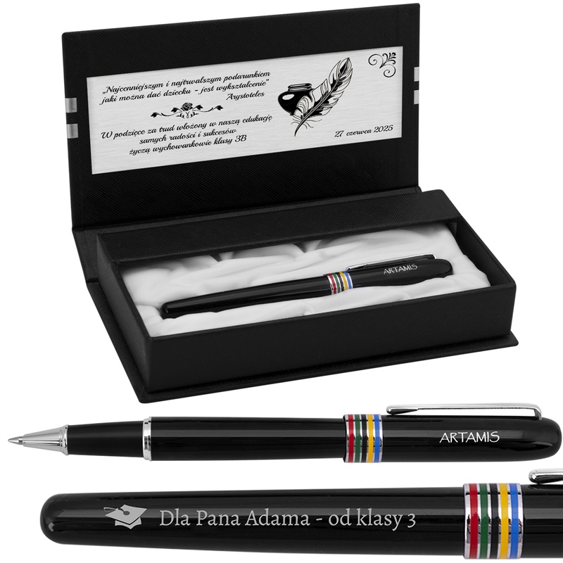 Szukasz oryginalnego prezentu, który zrobi wrażenie? Długopis Reo Black/Multicolour to idealne rozwiązanie! Ten elegancki długopis nie tylko świetnie się prezentuje, ale także łączy funkcjonalność z osobistym akcentem dzięki grawerowanej tabliczce.