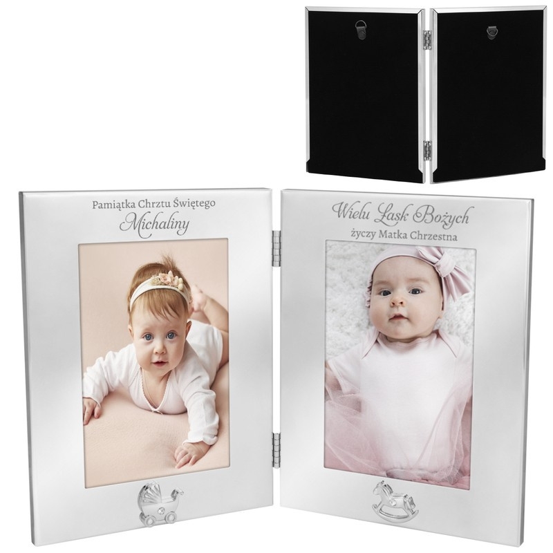 Nasza rozkładana ramka posiada podwójną konstrukcję, co sprawia, że wygląda niezwykle uroczo i wyjątkowo. Motywy wózka i konika na biegunach nadają jej niepowtarzalnego, dziecięcego charakteru, idealnie pasując do wspomnień z okresu najwcześniejszych lat życia maluszka. Możliwość umieszczenia dwóch zdjęć jednocześnie sprawia, że staje się ona nie tylko dekoracją, ale także unikalnym sposobem na opowiadanie historii poprzez obrazy.