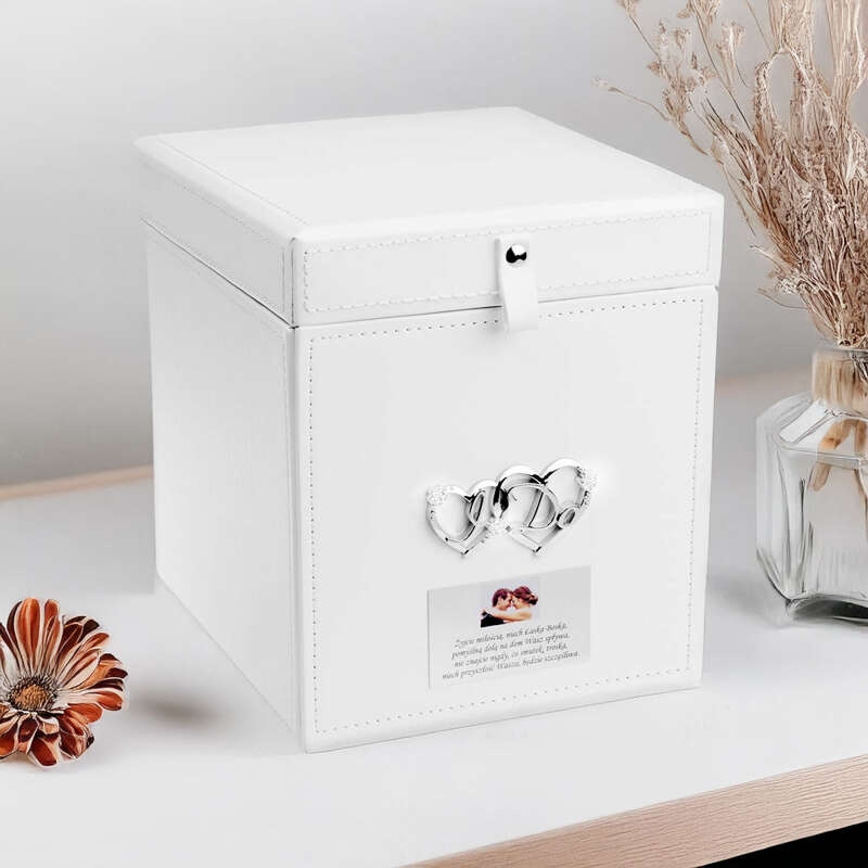 Nasza szkatułka to więcej niż tylko przedmiot – to osobista podróż do miejsc pełnych emocji i wspomnień. Wewnątrz znajdziesz trzy albumy na zdjęcia, w których możesz umieścić ulubione fotografie z wesela, rocznicy czy innej wyjątkowej chwili. Dodatkowo, każda szkatułka zawiera indywidualną dedykację, co czyni ją niepowtarzalnym prezentem dla najbliższych. Dzięki temu, każda chwila, którą w niej przechowasz, zyska na wartości i stanie się jeszcze bardziej osobista.