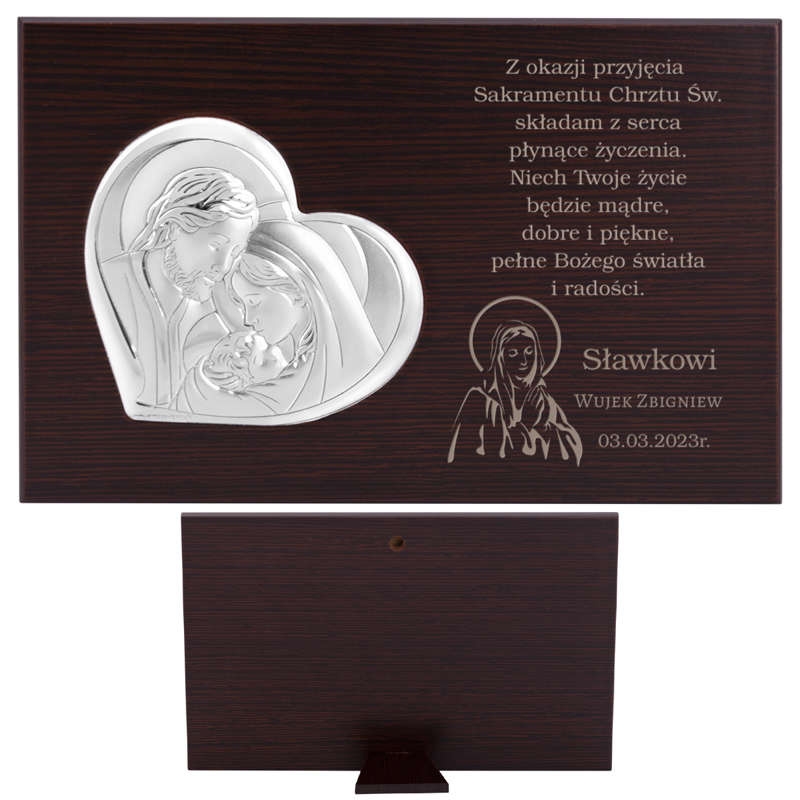 Nasz elegancki obrazek wykonany jest z wysokiej jakości drewna, które stanowi solidną podstawę dla posrebrzanej tabliczki. Dzięki zastosowaniu technologii grawerowania laserowego, możemy umieścić na nim unikalny tekst – imię dziecka, ciepłe życzenia lub inspirujący cytat biblijny. To nie tylko uczyni prezent wyjątkowym, ale sprawi, że będzie on bliski sercu na długie lata.
