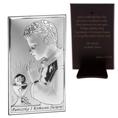 Obrazek srebrny z grawerem to świetny pomysł na prezent od rodziny, chrzestnych, czy bliskich przyjaciół. Podaruj dziecku coś naprawdę wyjątkowego, co będzie mu przypominało o tym szczególnym dniu. Nasz obrazek doskonale sprawdzi się jako element dekoracyjny w pokoju chłopca, na biurku czy na półce, będąc pięknym wspomnieniem I Komunii.
