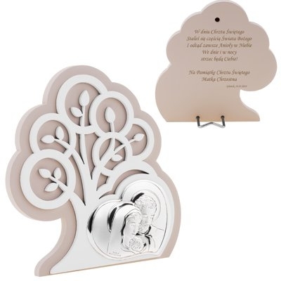Obrazek wykonany jest z najwyższej jakości materiałów, co zapewnia mu duralność i wyjątkowy blask. Srebrna powierzchnia dodaje elegancji, a precyzyjnie wykończone detale sprawiają, że każdy egzemplarz jest unikalny. Projekt przedstawia drzewo życia, które symbolizuje wzrost, siłę i ciągłość pokoleń. To idealny motyw na pamiątkę tak ważnego wydarzenia, jak chrzest.