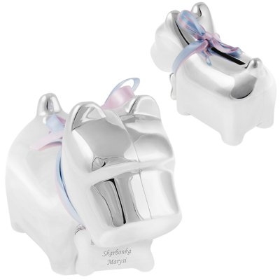 Zapraszamy do odkrycia naszej zachwycającej posrebrzanej skarbonki w kształcie uroczej pieska, która będzie doskonałym prezentem na Chrzest, pierwsze urodziny, a także na każdą inną okazję, gdzie chcemy podarować coś wyjątkowego. Ta skarbonka nie tylko stanowi praktyczny element do przechowywania drobnych oszczędności, ale także staje się piękną pamiątką na długie lata.