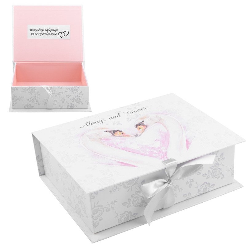 Pudełko Szkatułka z łabędziami to wyjątkowy produkt, który doskonale nadaje się na ślub, rocznicę lub inny ważny moment w życiu. To elegancka szkatułka, która połączy w sobie funkcję praktyczną oraz sentymentalną, stanowiąc wspaniałe miejsce na biżuterię i niezapomniane pamiątki.