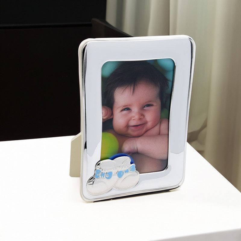 Nasza ramka wyróżnia się swoim **stylowym designem**, który uzupełniony jest pięknymi bucikami, symbolizującymi pierwsze kroki malucha. Kolor niebieski sprawia, że ramka doskonale wpisuje się w tradycyjne motywy związane z chłopcami, a posrebrzane wykończenie nadaje jej elegancji i blasku. Idealnie sprawdzi się jako dekoracja w pokoju dziecięcym lub jako wyjątkowy prezent dla rodziny czy przyjaciół.