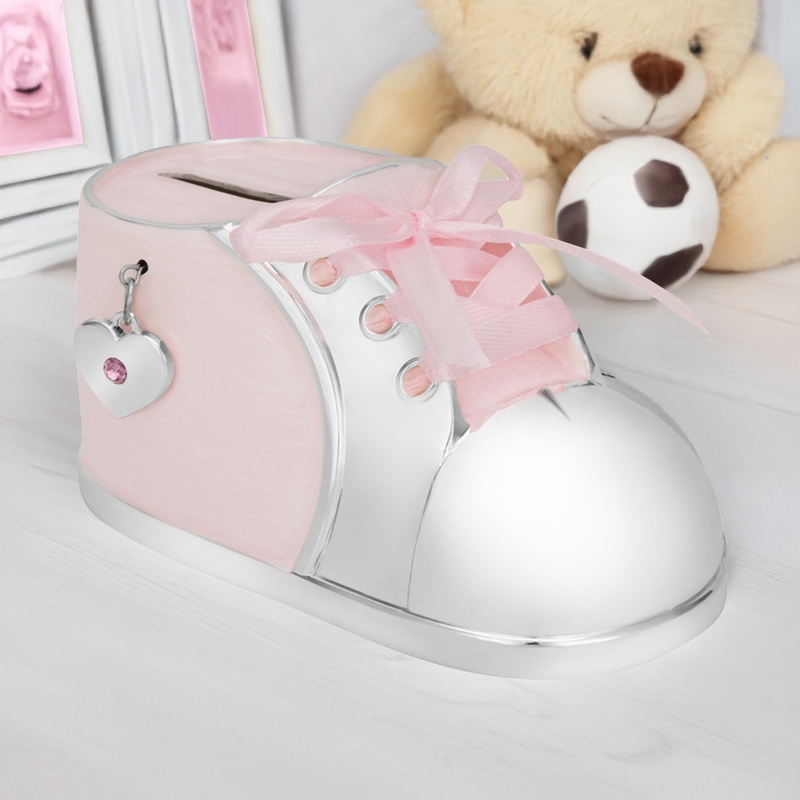 Nasza skarbonka została stworzona z posrebrzanego metalu oraz masy perłowej, co nadaje jej niepowtarzalny wygląd i trwałość. Zastosowany lakier ochronny sprawia, że figurka pozostaje błyszcząca i zachwycająca, niezależnie od upływu czasu. Dodatkowo, skarbonka ozdobiona jest subtelnym serduszkiem z cyrkonią, które nadaje jej wyjątkowego charakteru. Różowa wstążka, będąca uroczym elementem zastępującym sznurowadło, wprowadza do wnętrza delikatność i radość.