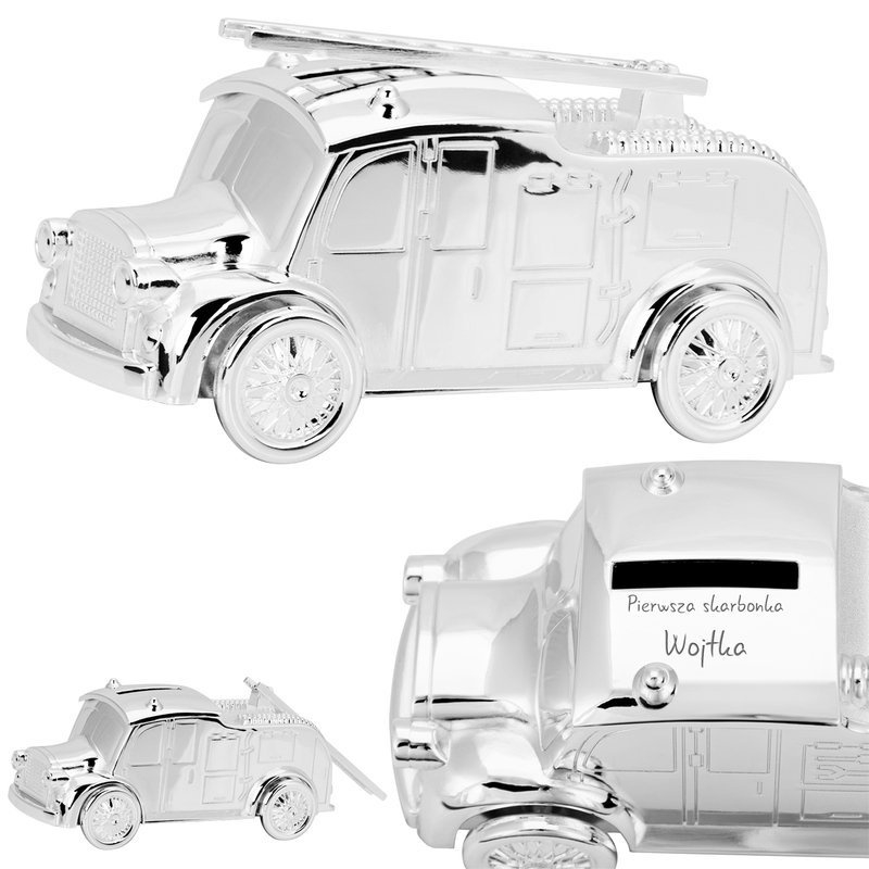 Niezaprzeczalnym atutem naszej skarbonki jest możliwość dodania personalizowanego grawerunku. Umieszczony na dachu pojazdu, może zawierać ulubiony cytat, imię obdarowanej osoby lub specjalne daty. Dzięki temu, skarbonka nabiera osobistego charakteru, co czyni ją doskonałym prezentem urodzinowym czy okolicznościowym dla fanów motoryzacji, małych strażaków oraz wszystkich kolekcjonerów.