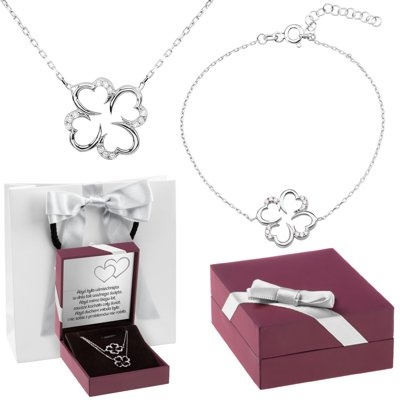 W skład kompletu wchodzi naszyjnik oraz bransoletka, obie zdobione subtelnymi cyrkoniami oraz urokliwym motywem koniczynki. Symbolem szczęścia, koniczynka jest nie tylko stylowym dodatkiem, ale także talizmanem, który przyciąga pomyślność i pozytywne energie.
