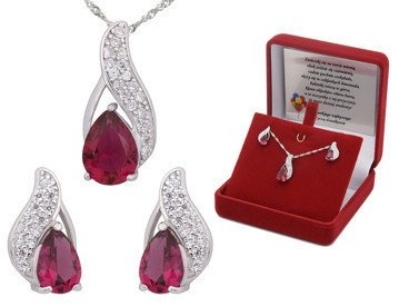 Srebrny komplet pr. 925 cyrkonia rubinowa Dedykacja to nieprzeciętny zestaw, który z pewnością stanie się ulubionym elementem Twojej biżuterii. Nie czekaj, dodaj odrobinę luksusu do swojego codziennego stylu i pozwól, by Twój blask zachwycał wszystkich wokół!