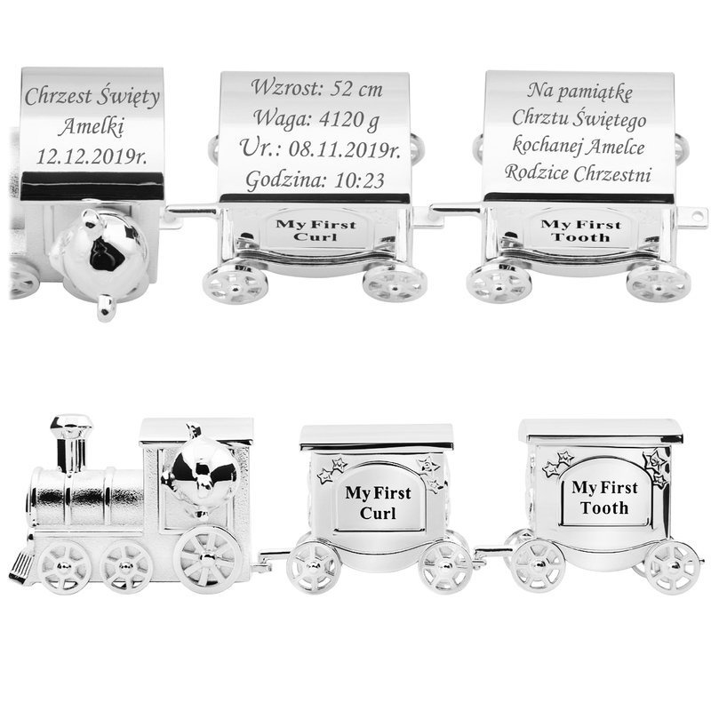 Odkryj wyjątkową szkatułkę pociąg z wagonami, która stanowi idealny prezent na roczek lub chrzest. Ta elegancka, posrebrzana szkatułka nie tylko zachwyca swoim wyglądem, ale także doskonale spełnia praktyczną funkcję – jest idealna do przechowywania pierwszego ząbka oraz pierwszego pukla włosów Twojego maluszka.