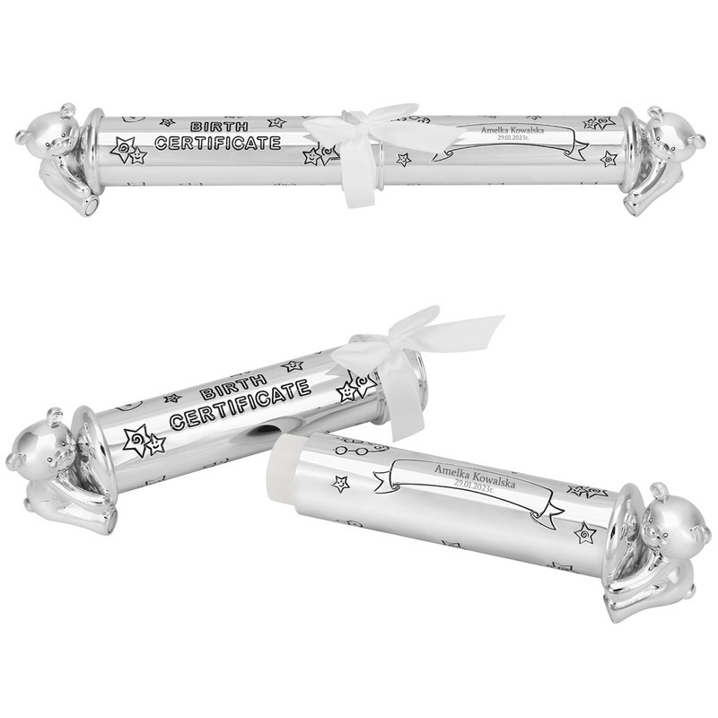 Nasza tuba została starannie wykonana z wysokiej jakości stali posrebrzanej, co zapewnia jej nie tylko stylowy wygląd, ale i trwałość na lata. Dzięki zastosowaniu specjalistycznego lakieru ochraniającego, blask tuby będzie towarzyszył jej przez długi czas. Dodatkowo, zdobienia w postaci uroczych, wypukłych misiów oraz subtelny, wytrawiony napis Birth Certificate sprawiają, że tuba zyskuje niepowtarzalny charakter, który zachwyci każdego gościa.