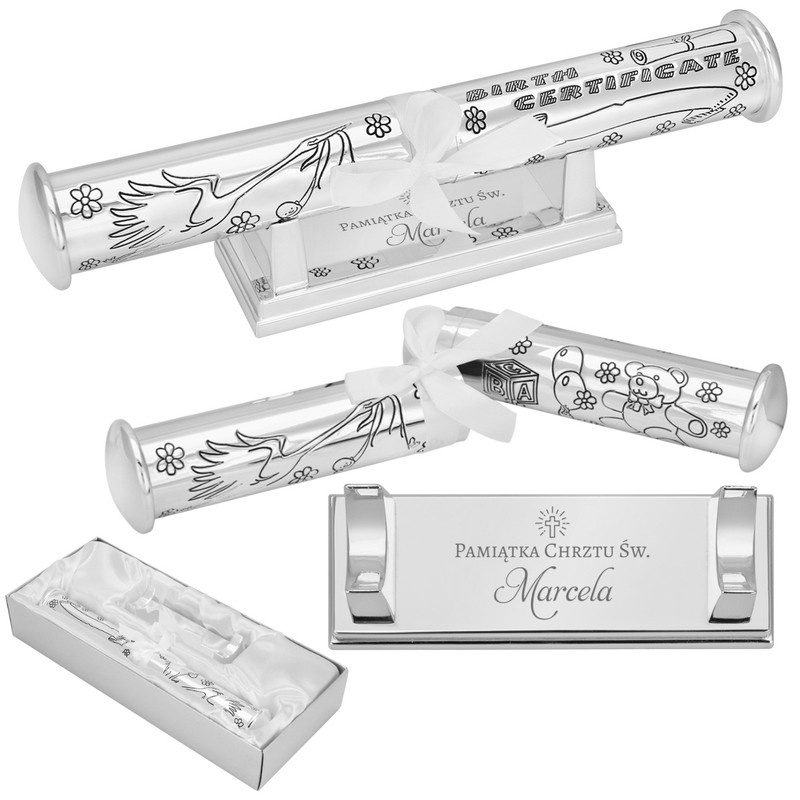 Nasza tuba na akt urodzenia została stworzona z wysokiej jakości stali posrebrzanej, co sprawia, że jest nie tylko estetyczna, ale również bardzo trwała. Pokryta lakierem ochronnym, długo zachowuje swój blask, dzięki czemu staje się piękną ozdobą w każdym domu. Ozdobione dziecięcymi motywami, takimi jak miś czy bocian, tuba wpisuje się w radosny klimat związany z narodzinami dziecka.