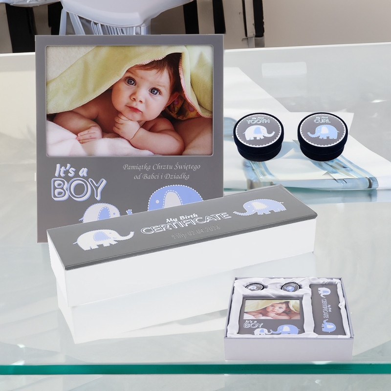 Odkryj nasz wyjątkowy zestaw, który składa się z eleganckiej ramki, dwóch urokliwych szkatułek oraz unikalnej szkatułki na certyfikat urodzenia. Ten zestaw to idealny sposób na przechowanie najcenniejszych wspomnień z ważnych momentów w życiu Twojego dziecka.