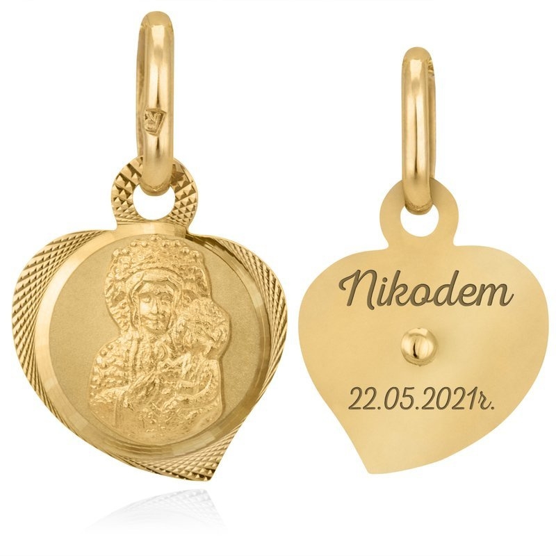 Medalik został wykonany ze szlachetnego złota o próbie 585, co gwarantuje jego trwałość i wysoką jakość. Jego unikatowy kształt serca z eleganckim szlifem przyciąga wzrok i emanuje ciepłem. W centralnej części umieszczony jest wizerunek Matki Boskiej Częstochowskiej, który dodaje medaliku wyjątkowego charakteru. To symbol opieki i miłości, który z pewnością stanie się źródłem pocieszenia i siły dla obdarowanego.