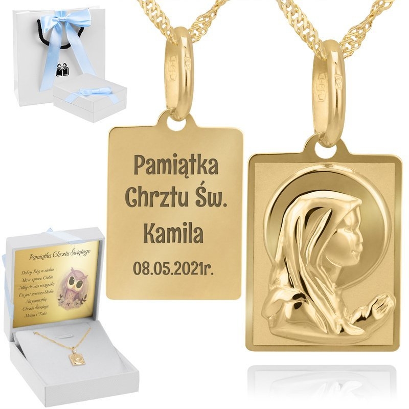 Odkryj piękno i głębię duchowego symbolizmu z naszym wyjątkowym złotym prostokątnym medalikiem z wizerunkiem Matki Boskiej. Ten elegancki dodatek nie tylko wspaniale się prezentuje, ale także niesie ze sobą głębokie przesłanie troski i opieki, idealny na ważne okazje, takie jak chrzciny, Komunia Święta czy bierzmowanie.